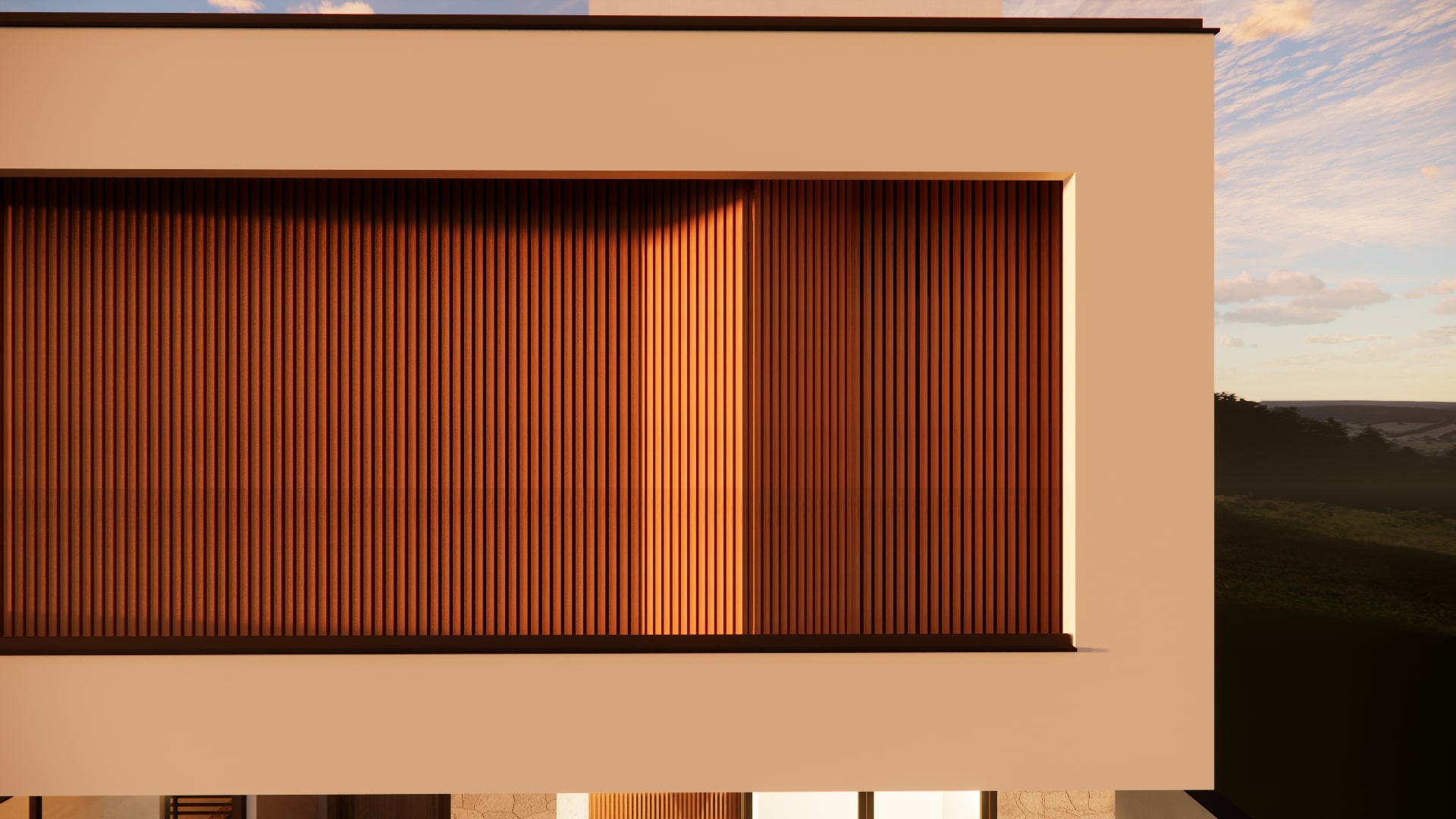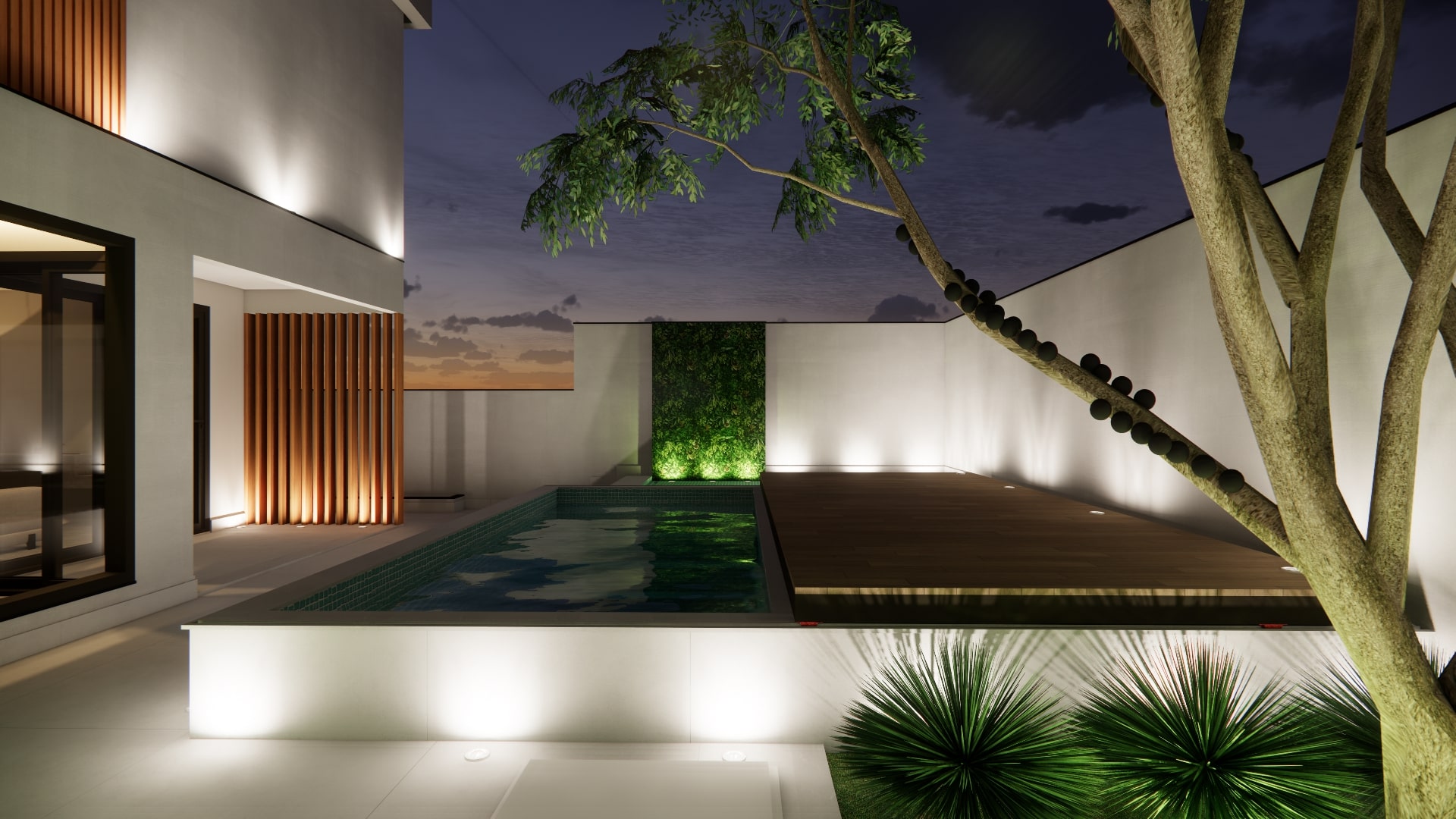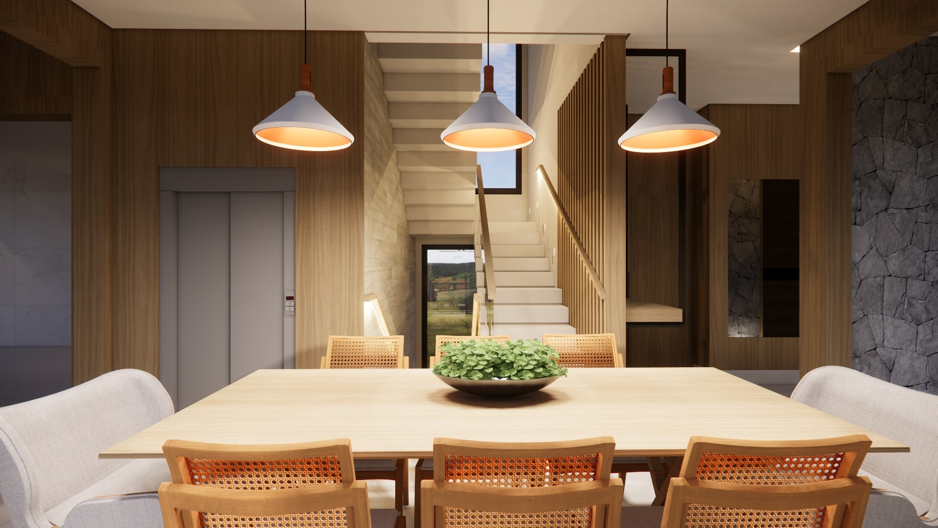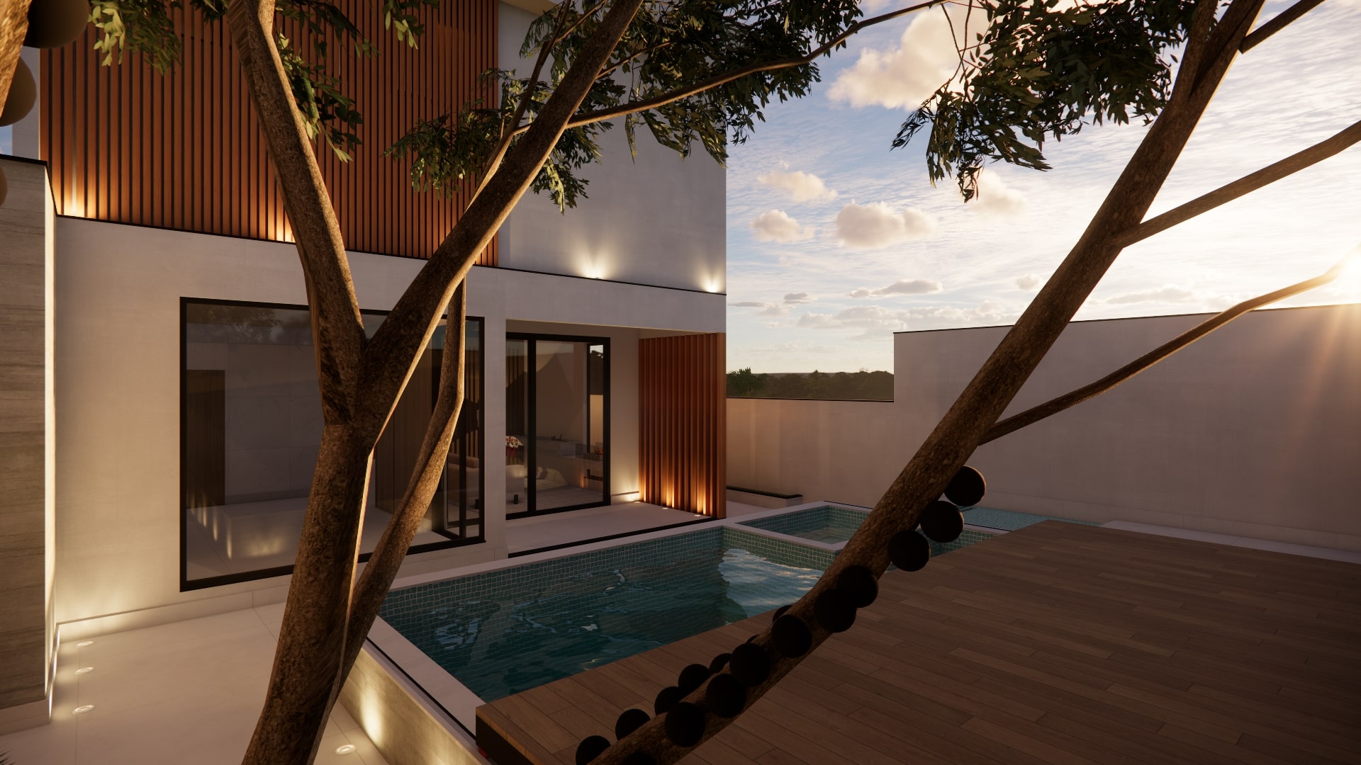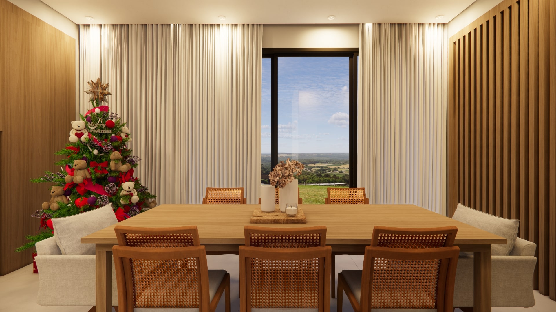 Falando um pouco mais sobre a decoração: eles amam o Natal (por isso a árvore ali), o pôr do sol, e apreciam aquela luz quente que entra pelas frestas da casa (por isso os renders com esse aspecto). A jaboticabeira foi o ponto de partida do projeto.