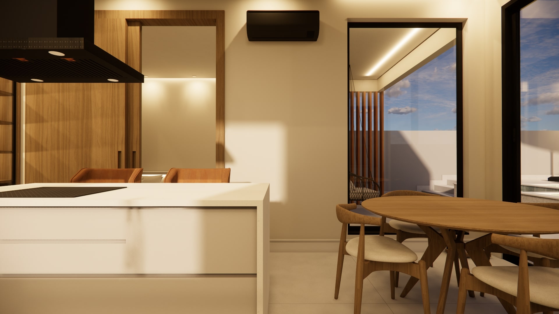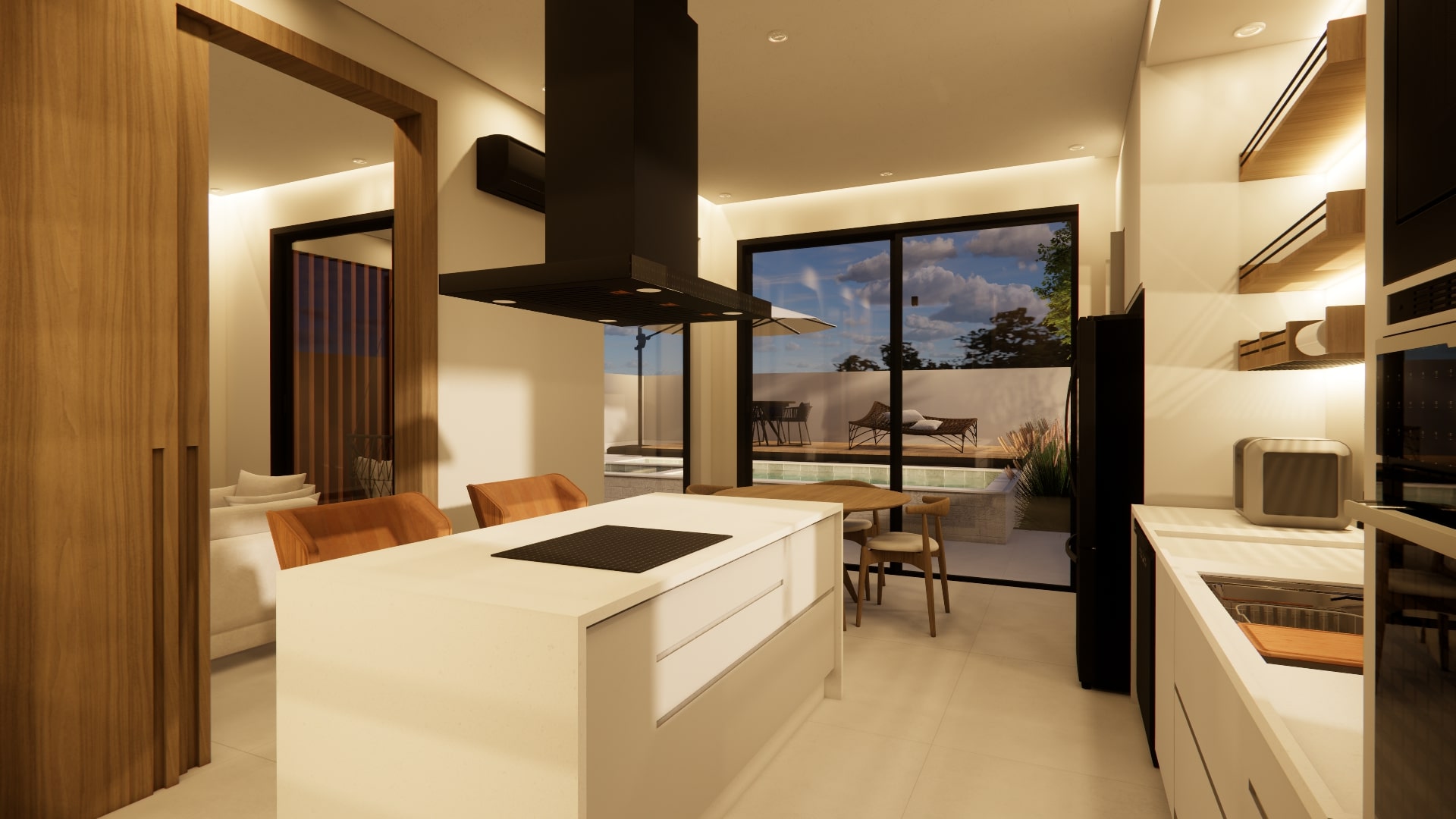 O projeto da Casa TM nasceu para traduzir essa identidade: uma residência ampla, com área social integrada, espaços de lazer generosos e janelas que se abrem para a área de reserva, transformando a paisagem em “quadros vivos”.
